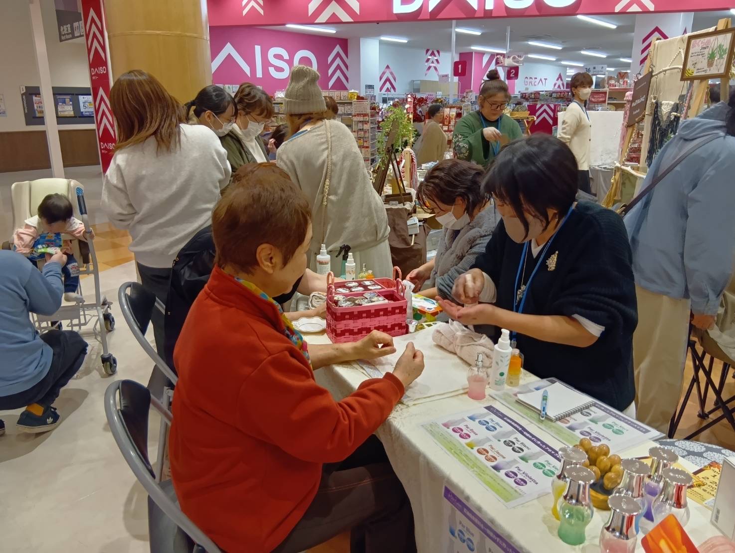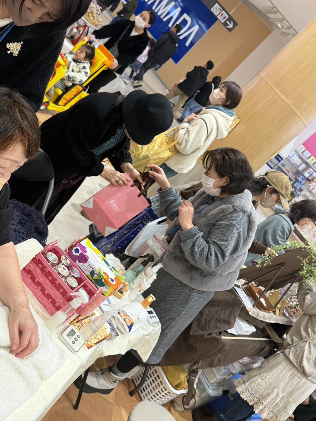 “シナリーハンドケア”で出店しました。面白い現象で、お客様が1人、2人いらっしゃいますと次々といらして下さり、ランチタイムも関係無く来てくださったのが嬉しかったです。前回、本社からいただいたサンプルのトラベルエコバースを使ったら、とても気持ち良かった!とか、施術に使ったブルーパルファンを買いたい!など、少しずつですが、シナリー製品の理解に繋がっている感じがしています。両方の手と肘から下の腕のケアに15分かけてますが、その間にお客様との会話の中でシナリーを知っていただける時間と思うとこんなチャンスは無い❣️と思っています。これからも来年1/17のワクワク市の参加、2/1には、新春お抹茶会も開催予定してます。 By 丹野文子